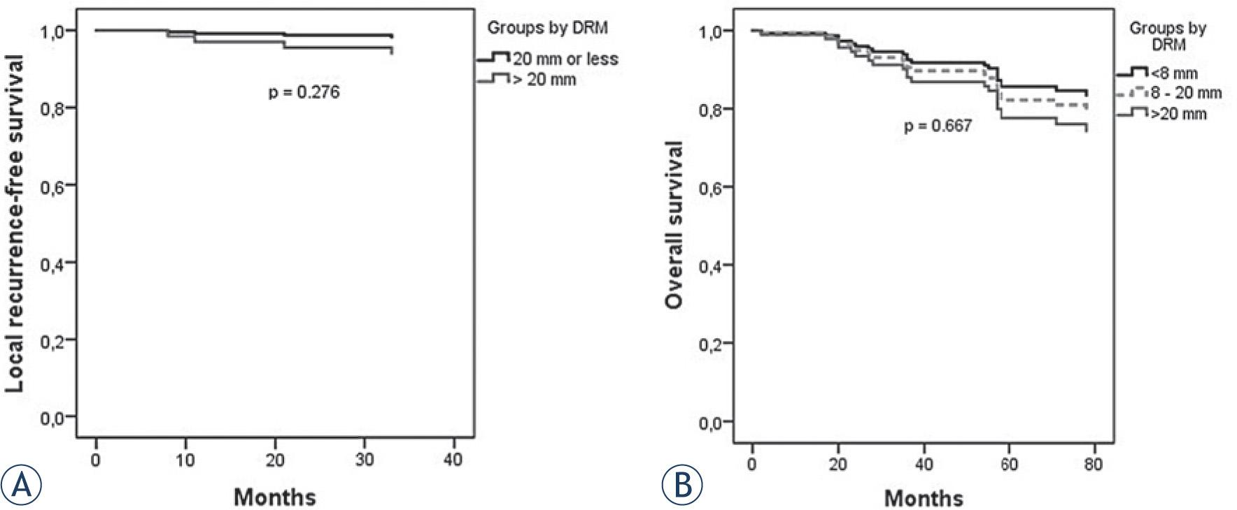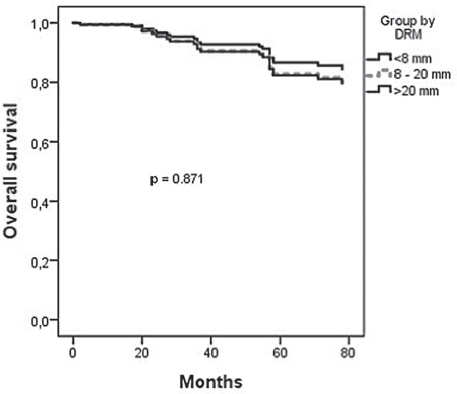 Another possible limitation of our study is that the lengths of DRMs were measured on fixed pinned specimens, whereas the 1 cm rule refers to margins measured by surgeons under fresh anatomically restored ex vivo conditions.32 There is no consensus on whether the margins should be measured in fresh or formalin-fixed specimens. Prospective measurements of DRMs with 5 different methods showed that margins were significantly smaller in unpinned than pinned specimens. Although no significant differences were observed in pinned specimens before or after fixation, there was a significant shrinkage after fixation in unpinned specimens.33 To avoid this and for consistency, we measured all of the DRM lengths in pinned and then fixed specimens.