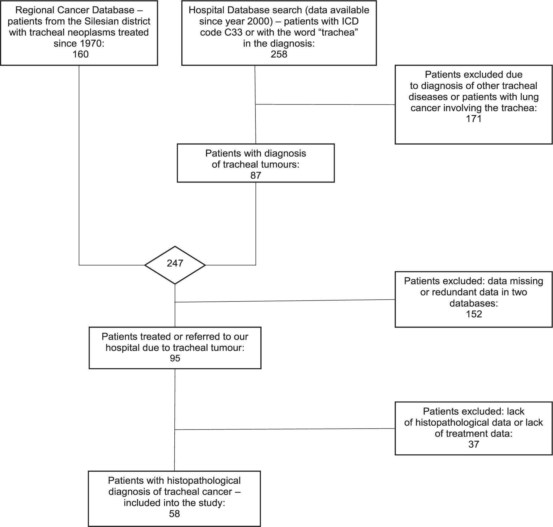 We conducted a retrospective study on patients diagnosed with TC in our institution between 1997 and 2015. The Regional Cancer Database and the Hospital Database were searched for patients with tracheal neoplasms. Among 418 patients (160 from the Regional Cancer Database and 258 from the Hospital Database), we found 58 cases that met the inclusion criteria (Figure 1).