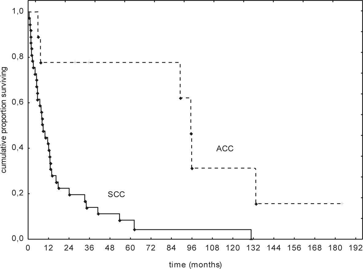 Overall survival of patients with adenoid cystic carcinoma (ACC) and squamous cell carcinoma (SCC).