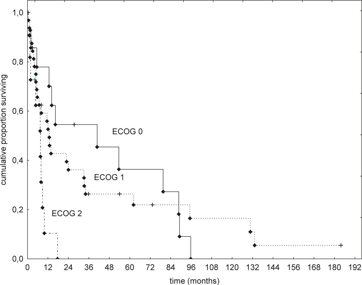 The performance status of 0 or 1 was associated with better prognosis than PS 2 in our series which is in line with previous reports. We found statistically significant influence of the smoking status on OS only in the univariate analysis, however, this difference was not statistically significant in the multivariate analysis. Other studies also did not report OS to be influenced by the smoking status.