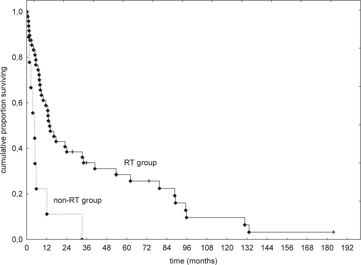 Radiotherapy as a sole or main treatment method was described by a number researchers.8, 11, 18, 19, 30–31, 33–34, 36 Only four studies present the outcome of at least 50 patients.8, 28, 31, 34 The median total doses usually ranged from 40 to 60 Gy2. In our series, the doses delivered ranged from 14 to 82.6 Gy2 and the median total dose delivered in radical radiotherapy was 66.0 Gy2. In some reports, an additional brachytherapy boost of 6 to 30 Gy was added to escalate the dose delivered to the tumour.19, 28, 34, 37, 38 In our series, three patients had a brachytherapy boost and the BT total dose ranged from 12.5 to 16 Gy2. In the studies cited above, five-year OS for patients treated only with radiotherapy ranged from 8 to 30.4%.19, 28, 31, 33, 34 Mornex et al. reported that the total dose over 56 (up to 70 Gy in their series) correlated with better outcomes - 12% for the higher TD compared to 5% for the lower.28 Hetnał et al. reported that patients with ACC histology treated with radiotherapy had better outcomes than SCC patients, and five-year OS were 80% and 9% for ACC and SCC, respectively.34 In our series, radiotherapy was a part of the treatment in 48 patients, and those patients who received RT had better overall survival in spite of large heterogeneity of the group (both radical and palliative treatments included), various fractionation schemes used, and no uniform target volume definition throughout the analysed period of time (Figure 4).