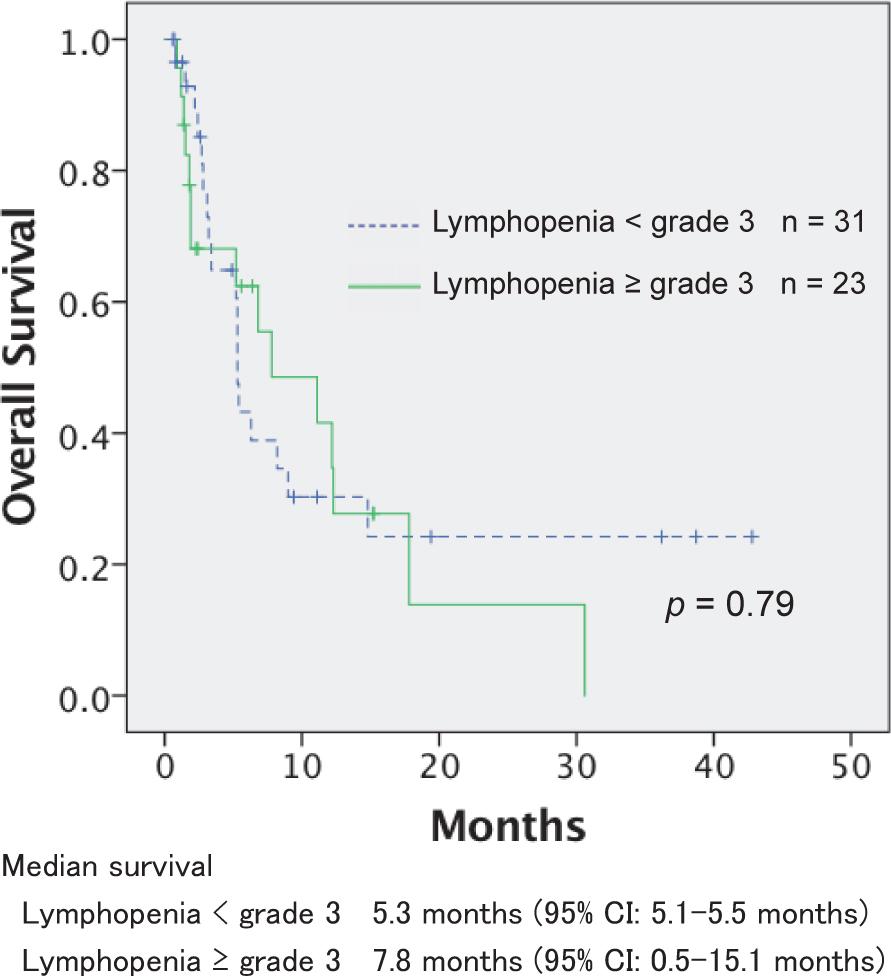 The median survival for all patients was 6.3 months (95% confidence interval: 4.1–8.5 months). The overall survival based on the grade of radiation-related lymphopenia is shown in Figure 2. There was no statistically significant difference in the overall survival of patients with LP3+ and the other grades of lymphopenia (p = 0.79).