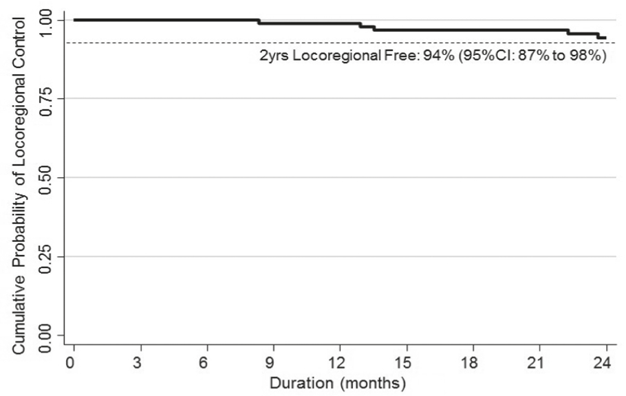 With a median follow up time of 33 months (inter-quartile range, IQR: 25–41 months), the 2-year LRFFS, DMFS and OS rates were 94%, 96%, and 99% respectively (Figures 1–3). Ninety-nine patients were alive at the last follow up of whom 84 patients without any evidence of disease. No patients developed second primary cancer.