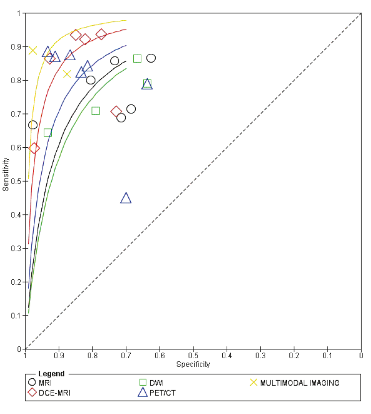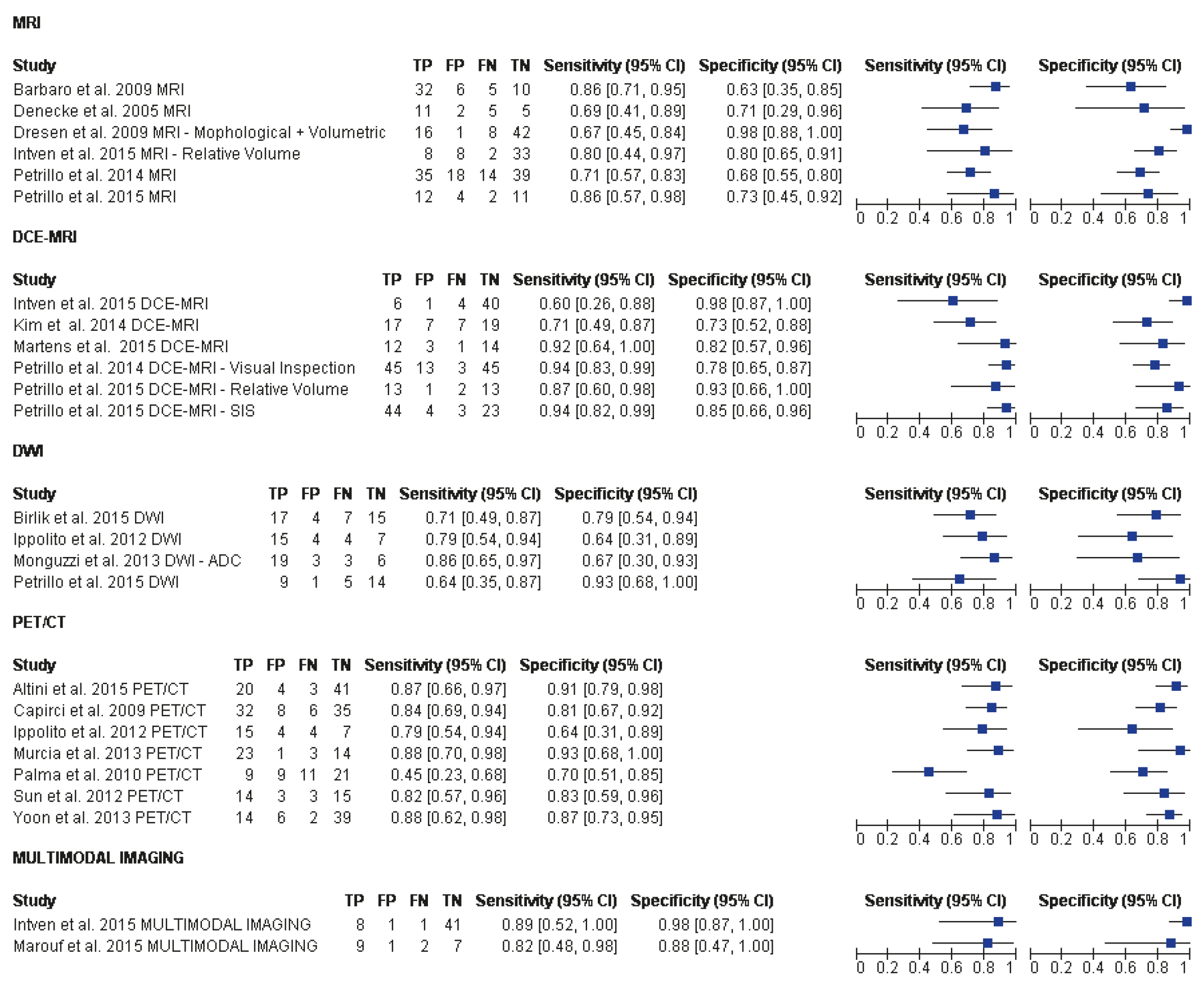 Performance pooled analysis for MRI, diffusion weighted imaging (DWI), dynamic contrast enhanced MRI (DCE-MRI), PET/CT and multimodal imaging