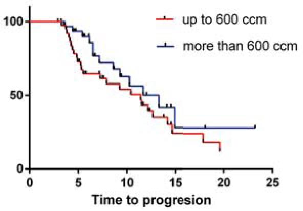 Time to progression for “V57Gy” volume. Threshold value was 600 cm3.