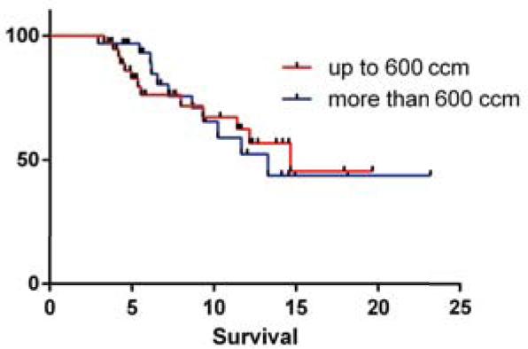Overall survival for “V57Gy” volume. Threshold value was 600 cm3.