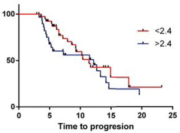 Time to progression for ration between brain volume and “V57Gy” volume. Threshold value was 2.4.