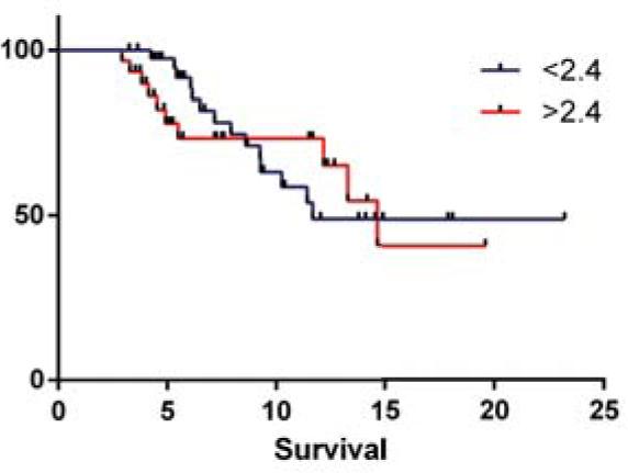Overall survival for ration between brain volume and “V57Gy” volume. Threshold value was 2.4.