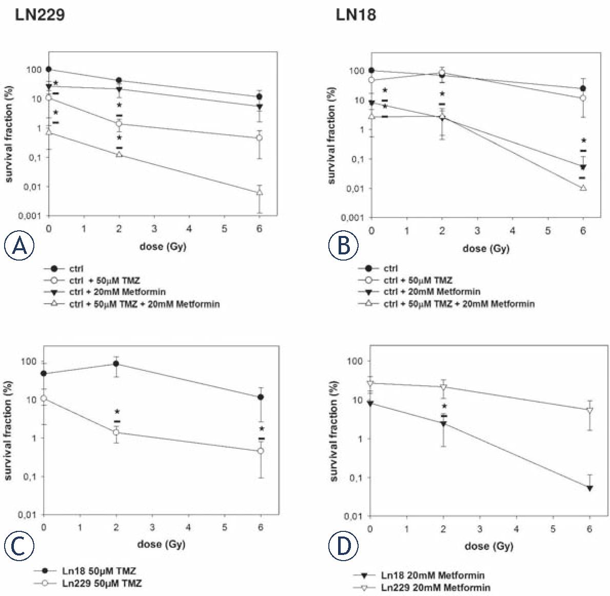 (A,B) Clonogenic survival assays of LN229 and LN18 glioblastoma cell lines after treatment with photon irradiation. (C,D) Clonogenic survival assays after comparing LN229 and LN18 cell lines after combined treatment with TMZ (C) or metformin (D). Error bars represent standard deviations. * shows a statistical significance (P <0.05). In LN229 enhanced cell kill was observed by TMZ and in LN18 cells lines metformin treatment resulted in increased cell toxicity compared to the control, as well as the combination of both agents itself. Combined bimodal and trimodal treatment results in superior cell toxicity.