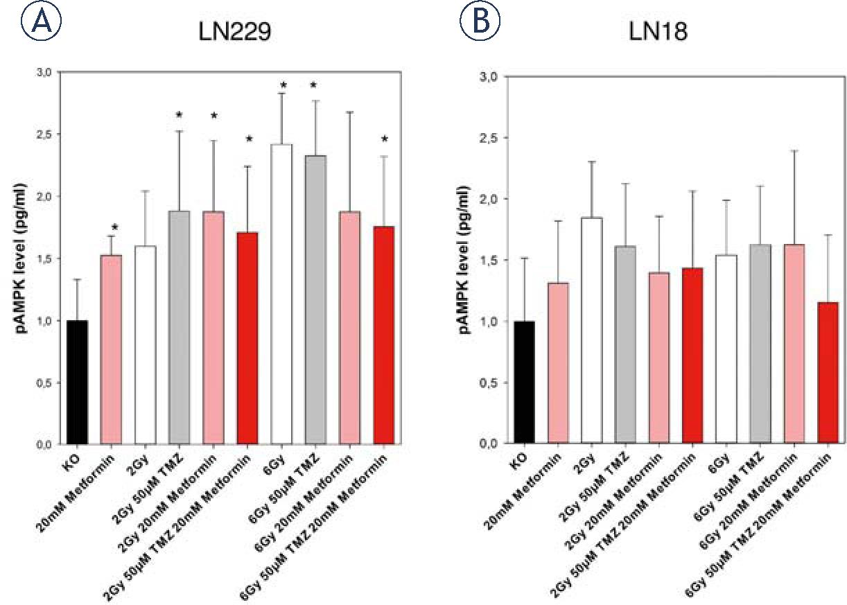 (A) In LN229 pAMPK measurements were significantly increased after treatment with Metformin, 2 Gy and temozolomide and 6 Gy combined with Metformin compared to the control if not otherwise specified (* p<0.05). (B) No significant increase of pAMPK levels were observed in cell line LN18. Error bars represent standard deviation.