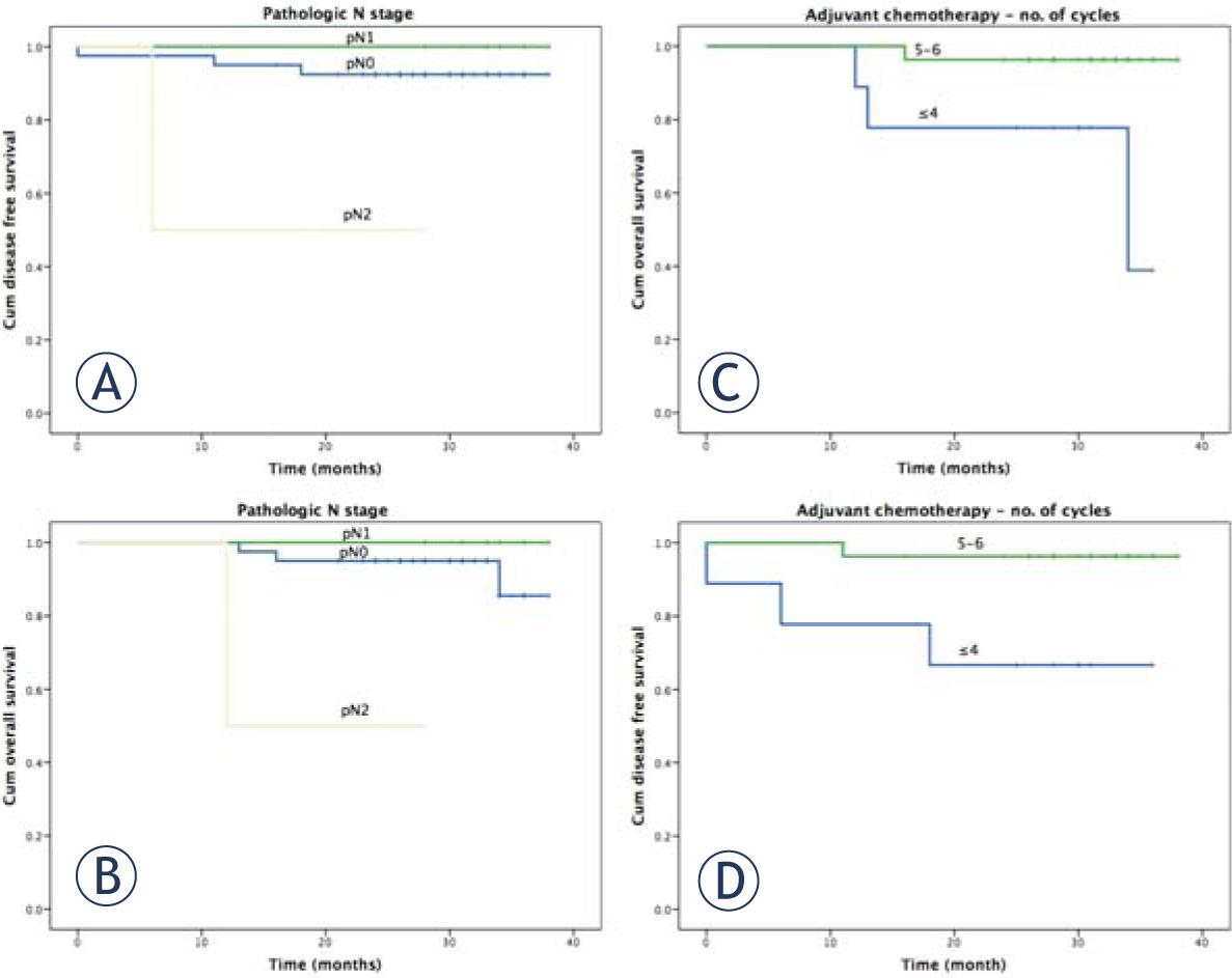 Cumulative 2-year LC, DFS, and OS were 100%, 90% (95% CI 98.4–81.6), and 92.2% (95% CI 99.6–84.7), respectively. The possible influence of potential prognostic factors on OS and DFS was determined by means of the log-rank test (Table 2). There was no link between gender, age, performance status, cT, cN, pT, or TRG and survival. Patients with pN2 had significantly worse OS and DFS (Figure 3). In the group of 36 patients that had an indication for adjuvant chemotherapy, we found that the patients who received 5–6 cycles of chemotherapy had significantly better OS and DFS compared with ≤ 4 cycles of chemotherapy (Figure 3). We found a trend toward different OS for patients in different TRG prognostic group, although nonsignificant. Two-year OS’s for good (TRG 4), intermediate (TRG 2–3,) and bad (TRG 0–1) prognostic groups were 100%, 93.3%, and 83.3%, respectively (p = 0.426). Local control, 2-year OS, and 2-year DFS were all 100% for 12 patients with pCR.