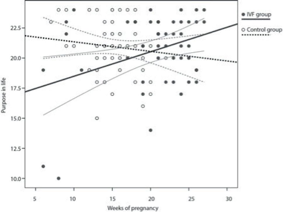 Comparison of satisfaction with various sections of quality of life (QLS), (PWB), depression (BDI) and anxiety SAS) among women pregnant up to within the IVF group (ANOVA test)_