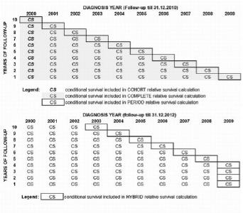 | Population-based relative survival follow-up | Diagnosis year of included patients | End of follow-up year | Relative survival approach |