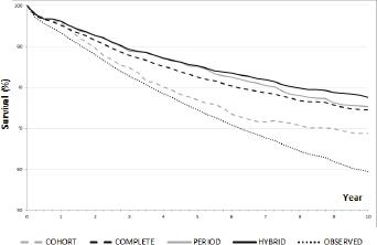 | Follow-up time | COHORT all patients diagnosed in 2000 | COMPLETE all patients diagnosed from 2000 to 2009 | PERIOD some patients diagnosed from 2000 to 2009 With period and hybrid approaches, only the most recently diagnosed survivors are included (the included incidence years are specified in Figure 1). | HYBRID some patients diagnosed from 2003 to 2009 With period and hybrid approaches, only the most recently diagnosed survivors are included (the included incidence years are specified in Figure 1). | ||||