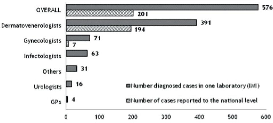 Of the total of 576 chlamydia cases with laboratory confirmation at the IMI during 2007-2010, only 201 cases (34.9%) were reported to the NIPH. There was a great variation in underreporting pertaining to different specialties of reporting physicians (Figure 1). Dermatovenerologists reported 49.6% of the diagnosed cases and gynaecologist 9.9% of the diagnosed cases. Other specialists did not report diagnosed cases at all.