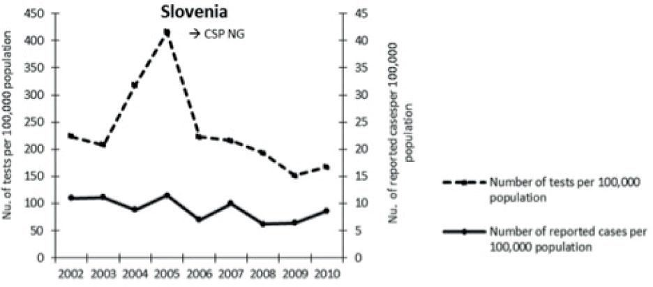 Chlamydia reported rates and testing rates, Slovenia, 2002-2010.