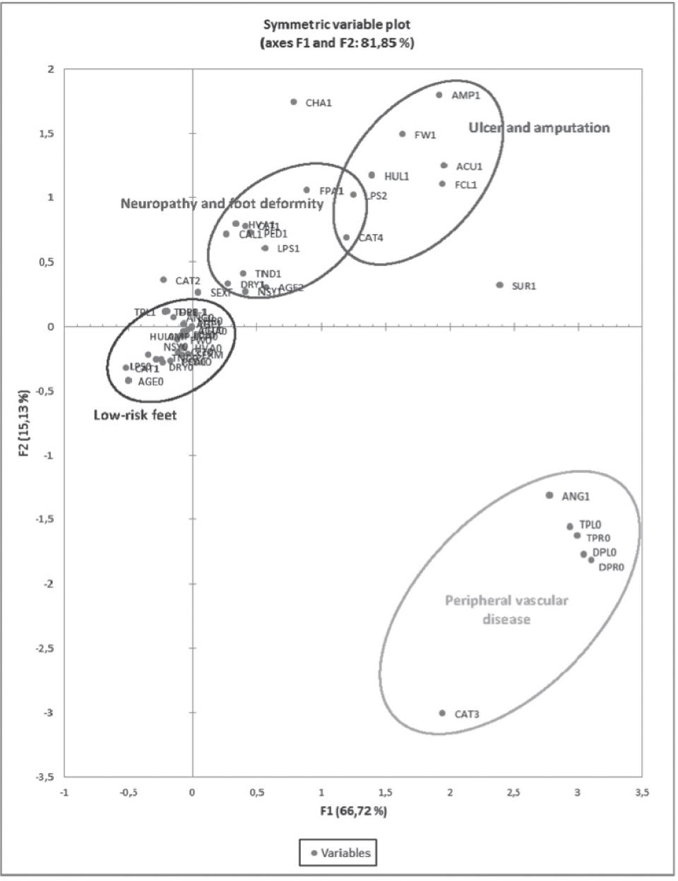 On the other side, the points representing the presence of particular foot deformities, loss of protective sensation, and acute foot ulceration are distributed in the right upper quadrant.
