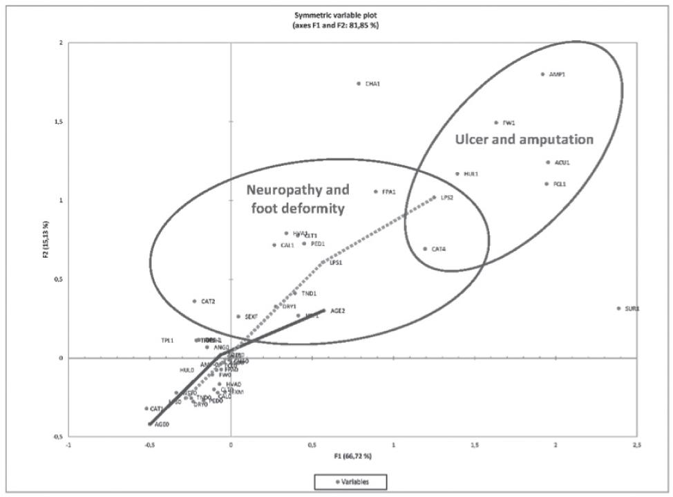 The decline of neurological functions (in particular vibrating sensation) with aging is well established (31, 32, 33). Accordingly, we found the position of points representing foot deformity and neuropathic symptoms close to the point of the age group over 70 years. Unfortunately, our protocol does not include the data on diabetes duration and metabolic control, which are known risk factors for chronic complications of diabetes (34).