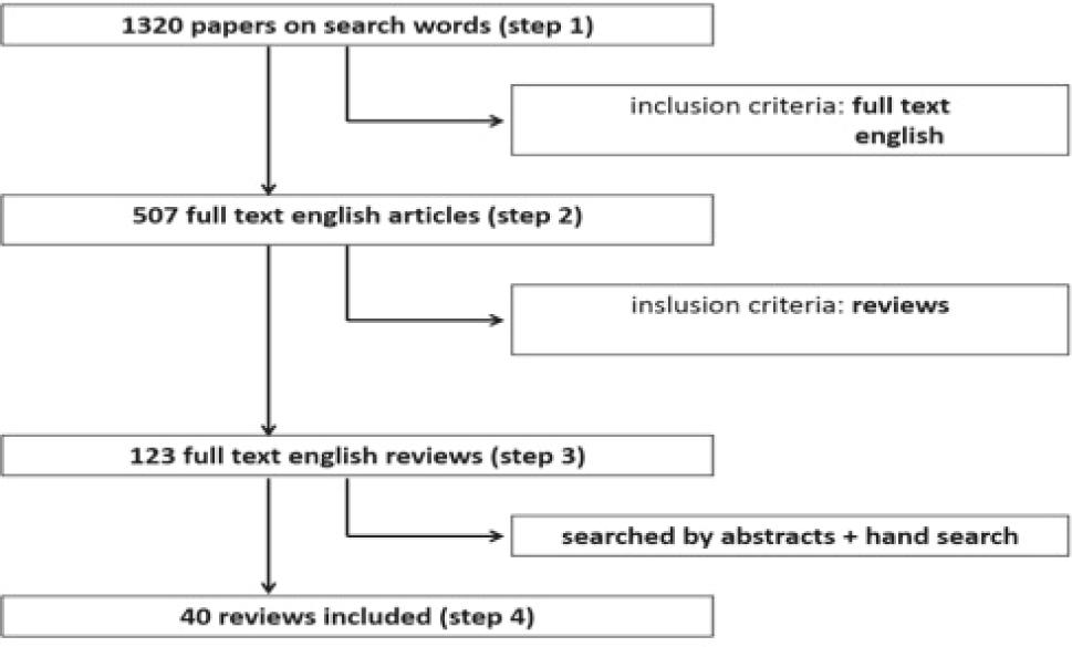 The first screen was performed using the following three inclusion criteria: full text availability; written in English; narrative review or systematic review or meta-analysis as the type of the articles (shorted: reviews) (Step 2).