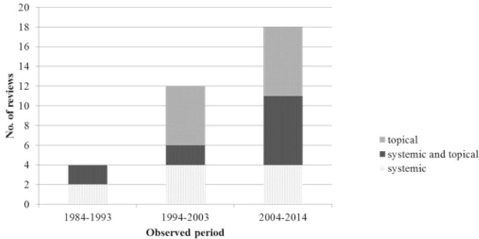 The number and substantive set of reviews about the preventive role of fluoride according to the publication date (PubMed, 1984-2014).