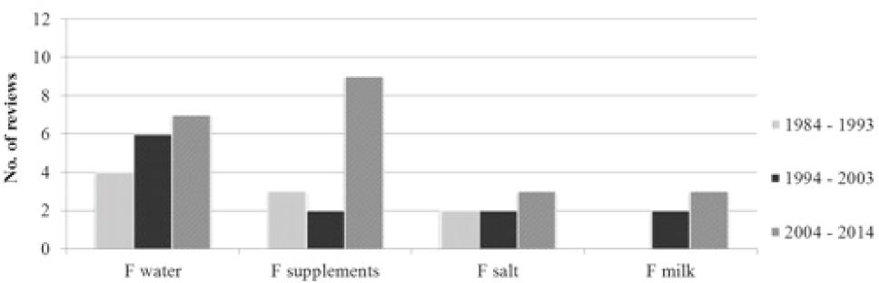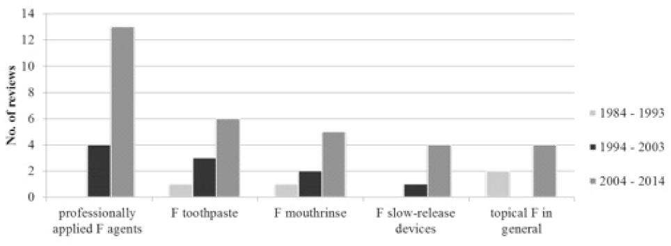 In the first observed decade (1984-1993), the main points of interest were systemic F. In the second decade (1994-2003), only half of the reviews were about systemic F. In the latest decade, only a minority of the reviews focused on systemic F, with half of the reviews during 2004-2014, describing topical F as a PHM. Most of the research on F prevention was done in groups of children and adolescents. It is thought that F use in caries prevention is also an important measure among adults and especially among the elderly.