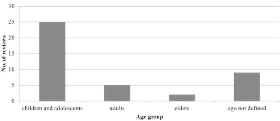 In Figure 5, we arranged the reviews according to the observed population. Eight reviews did not specify the group of interest according to age. In terms of using different F interventions, systemic F were observed in all age groups, but for the analysis of topical effects in adults and the elderly, the data were too limited or nonexistent.