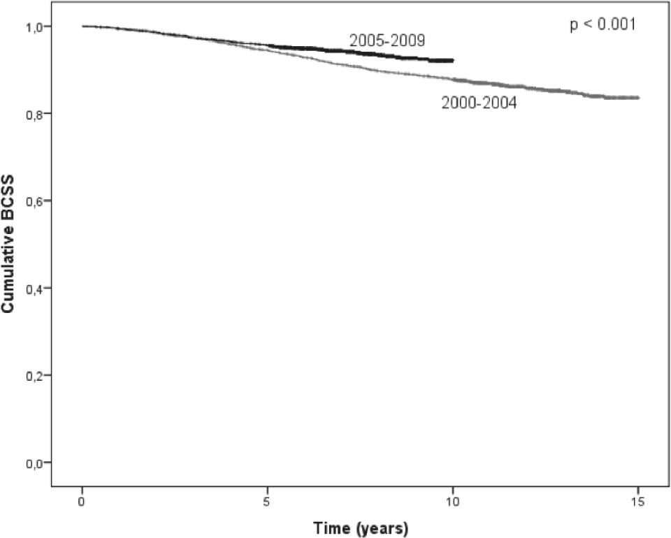 Kaplan-Meier plot of breast cancer specifi c survival (BCSS) probability for all Slovenian node-negative breast cancer patients according to the period of diagnosis (N=4740). BCSS was significantly better for patients diagnosed in the period 2005–2009, compared to those diagnosed in the period 2000–2004 (p<0.001).