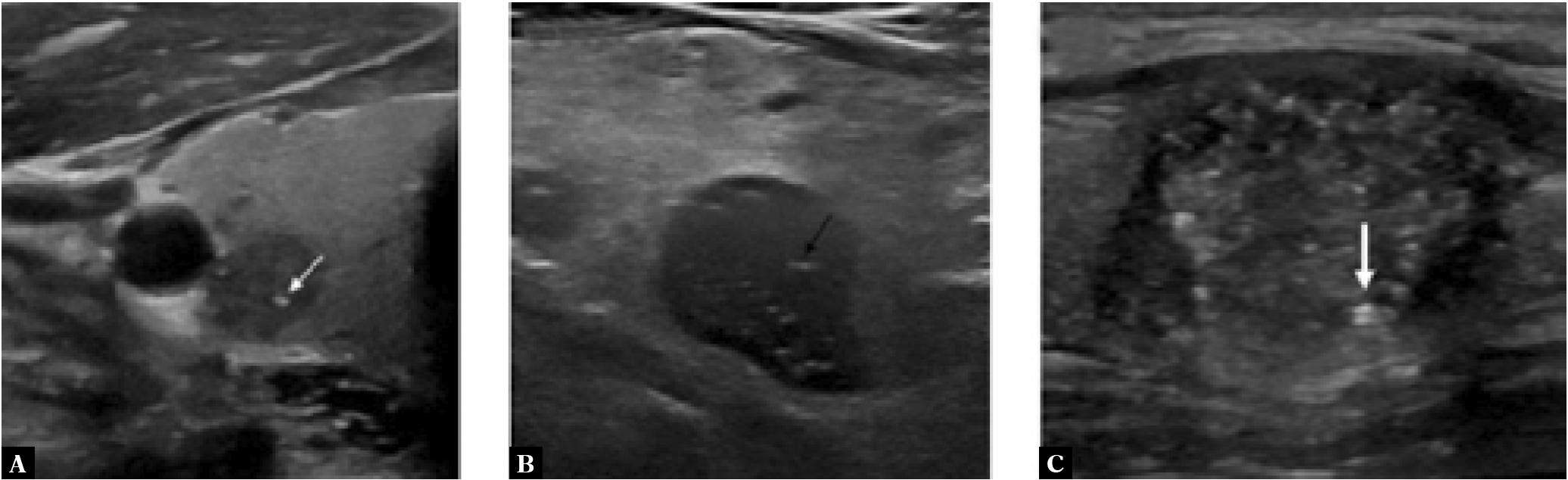 Greyscale sonographic images of: A. a thyroid nodule with round punctate echogenic foci (white thin arrow); B. a thyroid nodule with linear echogenic interfaces (black arrow); and C. a thyroid nodule with echogenic foci demonstrating a comet-tail artifact, in keeping with a colloid (white thick arrow)