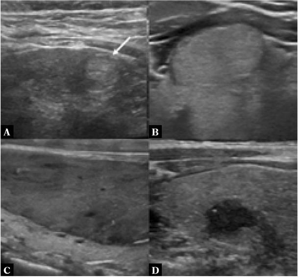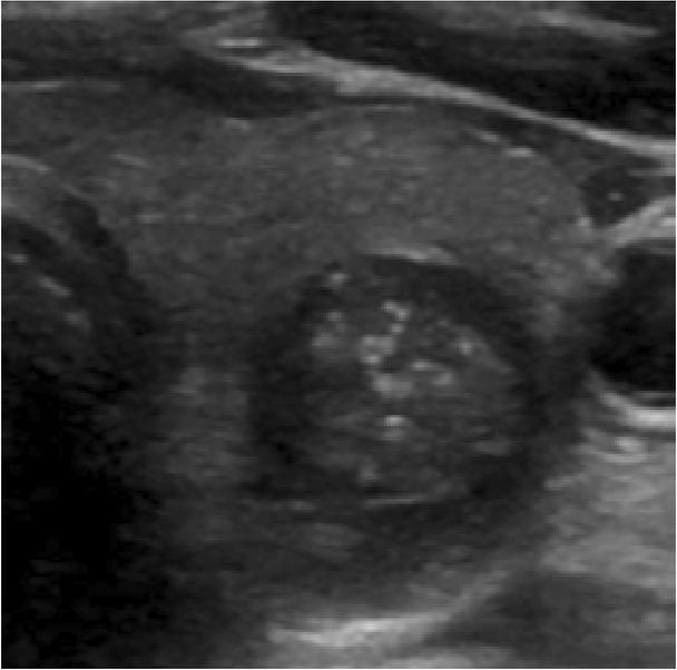 | Mixed cystic and solid | 1 | Hypoechoic | 2 | Lobulated or irregular | 2 | Peripheral (rim) calcifications | 2 | ||
