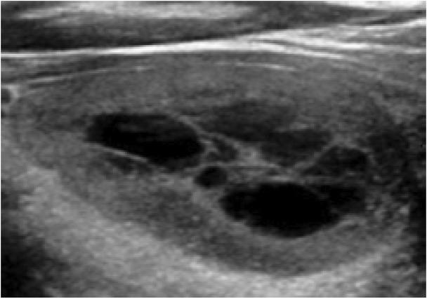 By definition, a spongiform nodule is one that is composed of >50% of small cystic spaces that are evenly distributed throughout the nodule – this appearance resembles a sponge (Fig. 7)(3). Intermediate nodules that do not meet this criterion but show a <80% solid volume should be described as being of mixed cystic and solid composition. When echogenic foci are found in a spongi-form nodule, these are not considered as PEF and should be ignored(4).