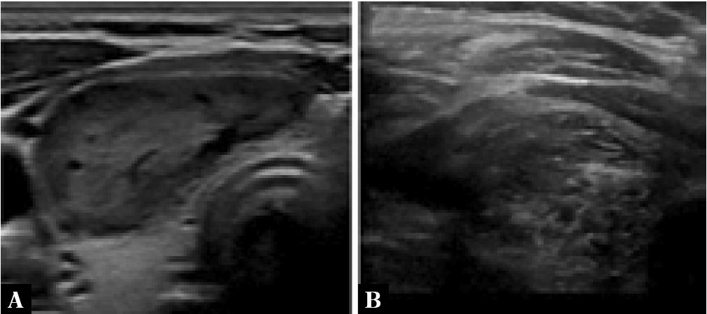 Greyscale sonographic images of thyroid nodules with heterogeneous echogenicity: A. a mixed isoechoic and hypoechoic thyroid nodule (since >50% of the nodule is hypoechoic, this will be the descriptor selected for scoring); and B. a 50% isoechoic and 50% hypoechoic thyroid nodule (in this case, the more conservative ‘isoechoic’ descriptor will be selected for scoring)
