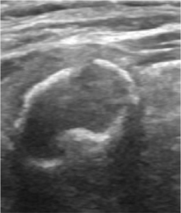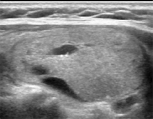 Greyscale image of a thyroid nodule which would be classified as ‘solid’ based on >80% solid volume