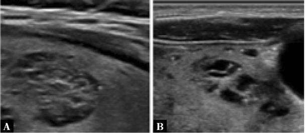 Greyscale sonographic images of: A. spongiform nodule and B. a mixed cystic and solid nodule. Compared to (B), the cystic spaces are smaller and more evenly distributed (A)