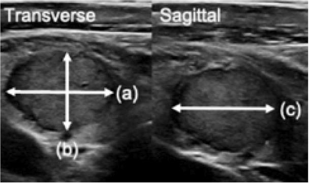 Greyscale sonographic images of a thyroid nodule, demonstrating how to measure nodule size, (a) × (b) × (c)