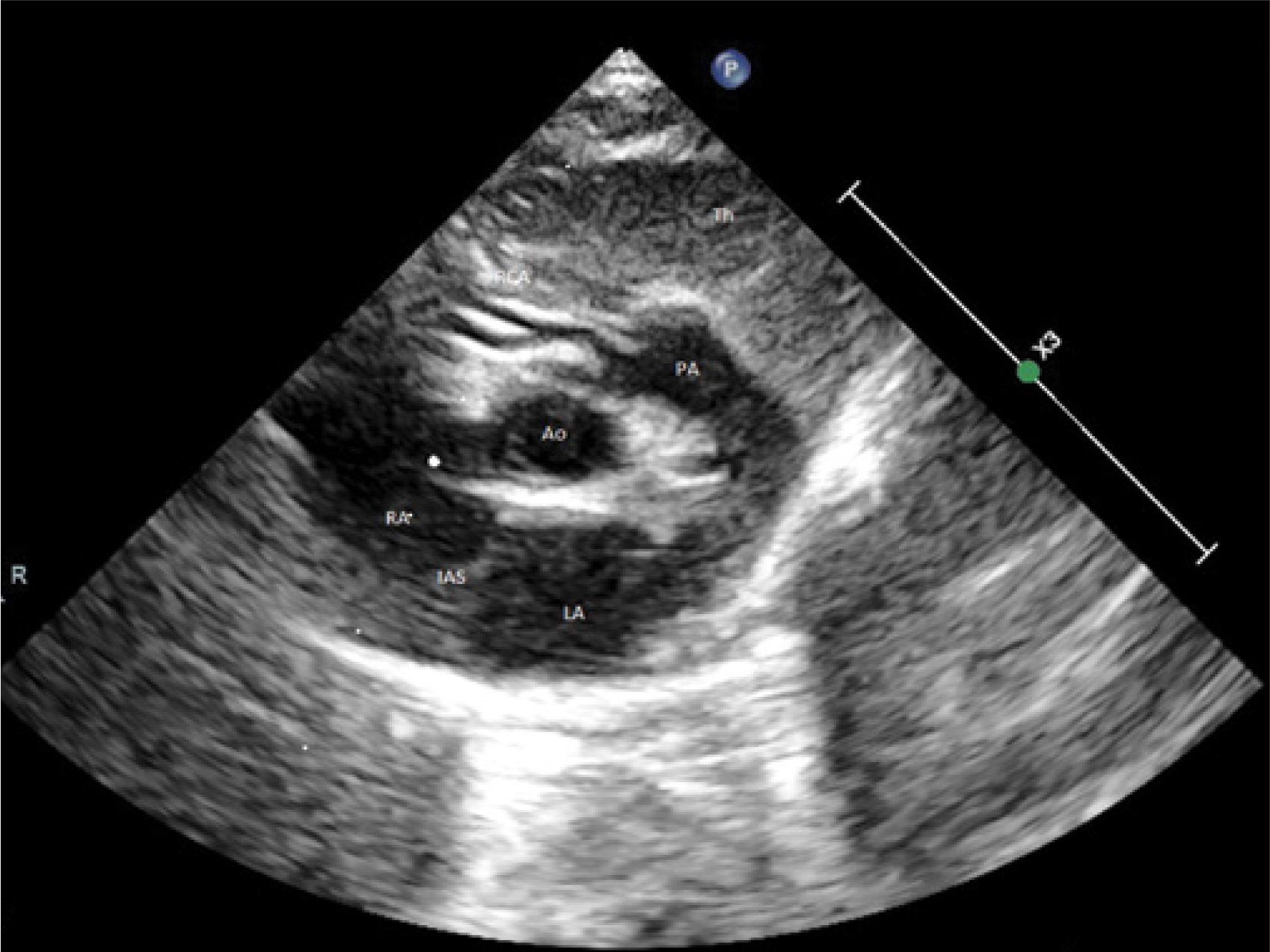 Origin of the right coronary artery from the pulmonary artery visualized in ECHO 2D, in modified cross-sectional vascular parasternal projection. PA – pulmonary artery, Ao – cross-section of the initial segment of the ascending aorta, RCA – right coronary artery, LA – left atrium, RA – right atrium, Th – thymus, IAS – interatrial septum