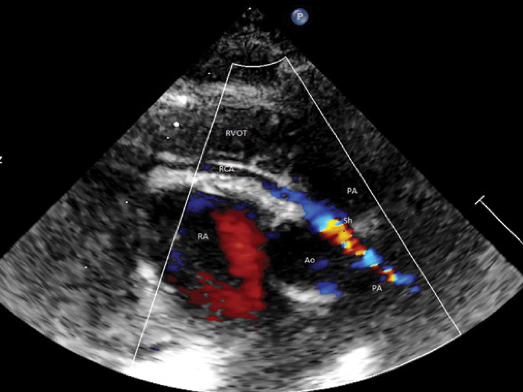 Preoperative ECHO. Modified cross-sectional parasternal vascular projection. See the inflow from the right coronary artery to the pulmonary artery. Ao – cross-section of the ascending aorta, PA – pulmonary artery trunk, RCA – right coronary artery, RVOT – right ventricular outflow tract, RA – right atrium, Sh – RCA-PA shunt.