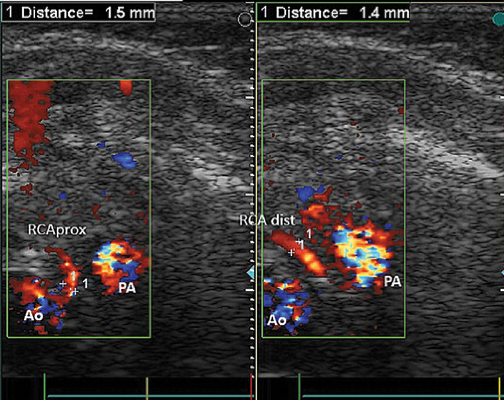 Postoperative ECHO. The initial segment of the right coronary artery in postoperative examination (18 days postoperatively). In order to achieve appropriate resolving power, a linear transducer was employed along with the color Doppler scale allowing representation of low flow rates (0.15m/s). Due to the arched course of the coronary artery making it impossible to capture the entire initial segment in a single image, two image frames are presented visualizing the consecutive fragments of the vessel. Uniform, laminar flow from the aorta (red color-coded) was visualized along the entire length of the examined vessel. Ao – aortic bulb, PA – initial segment of the pulmonary trunk, RCA – right coronary artery