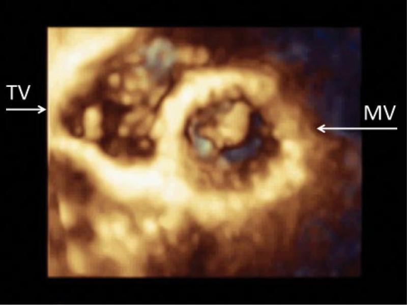A three-dimensional view of mitral and tricuspid valves. Leaflet morphology is visualized. The three-dimensional view allows for the assessment of the tricuspid valve in a transverse plane. TV – tricuspid valve, MV – mitral valve