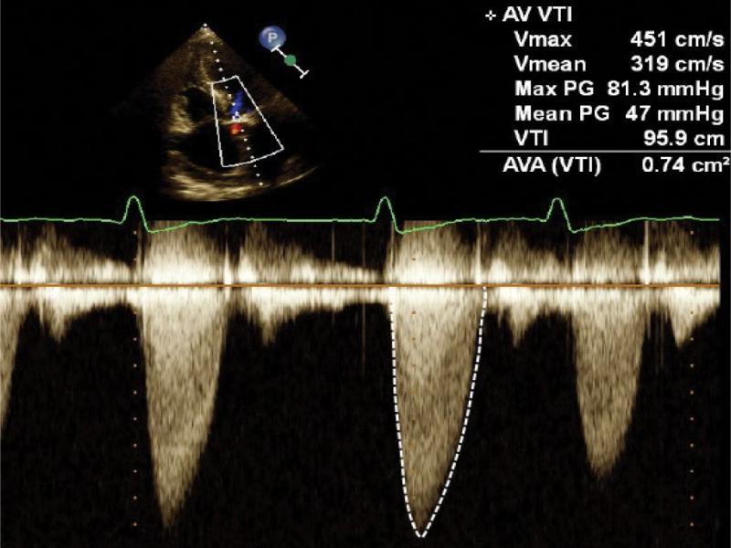 Aortic stenosis. Flow spectrum in continuous wave Doppler. Peak velocity (Vmax), peak gradient (max PG) measurements, and aortic valve area (AVA) measurement using the equation of continuity are displayed