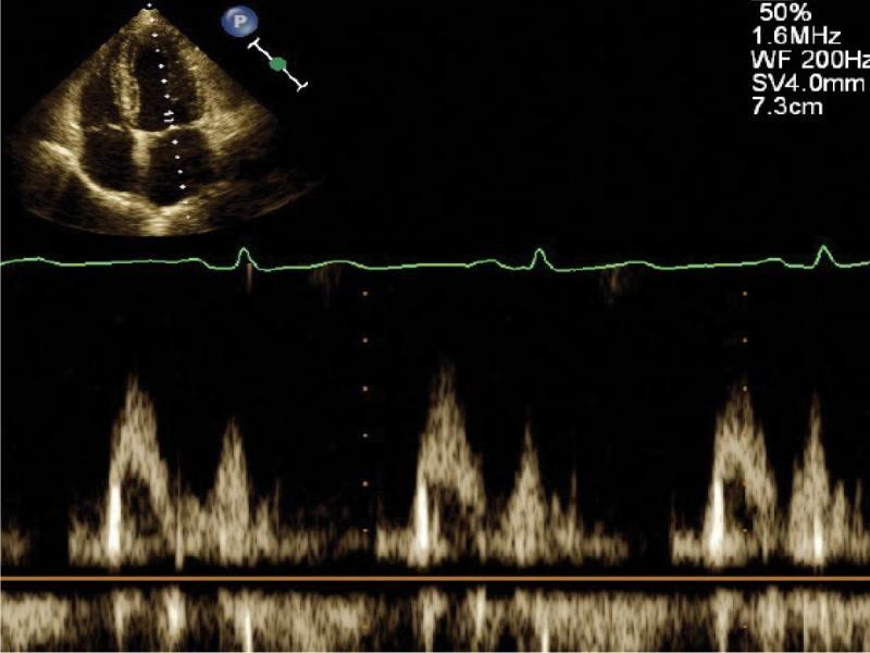 Normal biphasic inflow into the left ventricle through the mitral valve in PWD in apical 4-chamber view