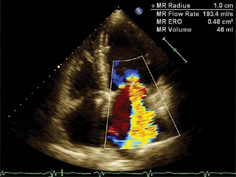 A two-dimensional view of mitral regurgitation jet in color Doppler imaging in apical 4-chamber view. Altered color scale (Nyquist limit) and the PISA phenomenon along with the measurement of its radius (MS radius) and calculations of mitral effective regurgitant orifice area (MR ERO) and mitral regurgitant volume (MR volume)