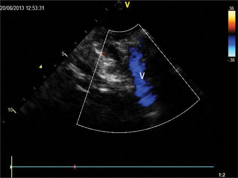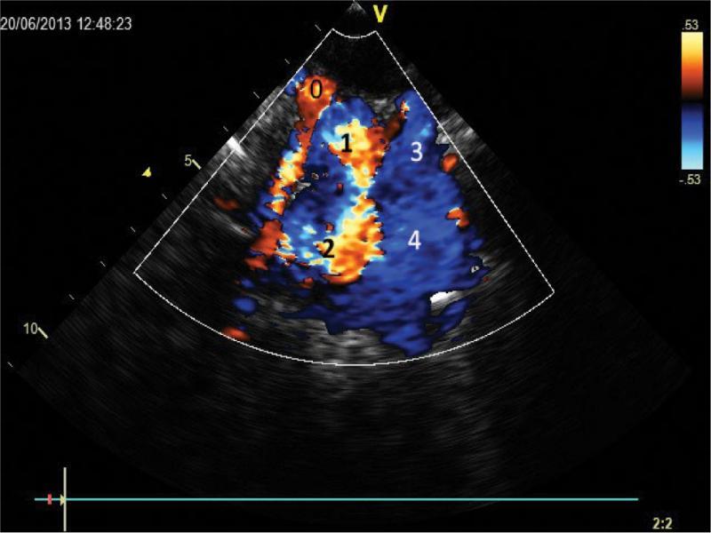 Cross-section showing the upper mediastinum in an inclined plane close to the plane where the aortic arch passes. Visible distal transverse portion of the arch (1) and the initial segment of the descending aorta (2). Systole. The scale of representation of flow velocities with color is adjusted to the visualization of relatively low velocities (max. 53 cm/s, so the aorta is filled with mosaic color dominated by blue (downward flow). A wide vessel (3) runs laterally to the left and posteriorly from the aorta, with a continuous downward flow much at a velocity considerably lower than in the aorta. The inferior segment of the vessel (4) crosses the thoracic aorta posteriorly; the further course of the vessel cannot be traced. Multiple color artefacts caused by proximity to the vessels of aerated lung tissue (0)