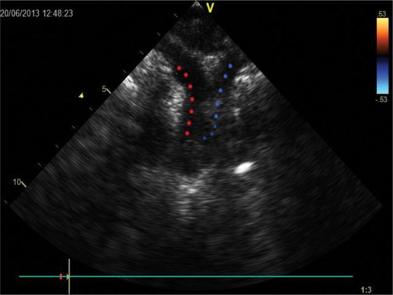 Image presented in Fig. after color removal. Without color, the vein which passes retroaortically (red dotted line) is far less clearly visualized, but its lumen can still be identified (blue dotted line)