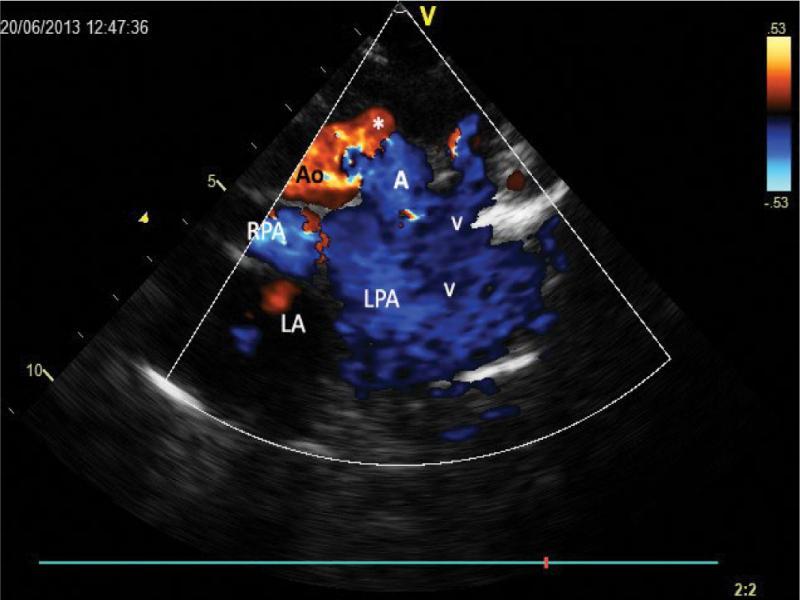 Cross-section in a plane close to frontal (with slight head rotation). Visible proximal part of the aortic arch (Ao) and its transverse section; a vertically running vein (V) crosses posteriorly the left pulmonary artery (LPA) and the descending aorta. Multiple respiratory artefacts obscuring the view of vascular flow. LA – left atrium, RPA – right pulmonary artery