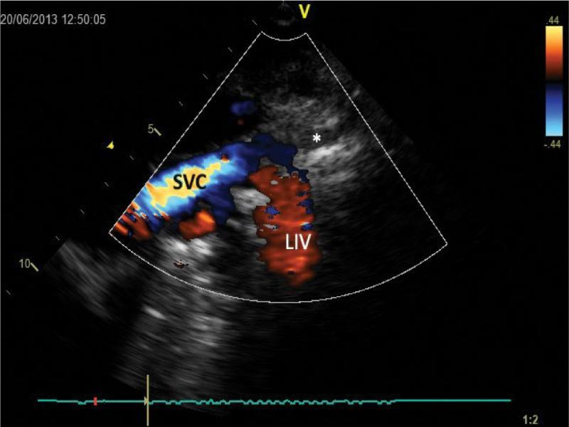 High parasternal view (right) visualizing mediastinal structures in the sagittal plane. Superior vena cava (SVC) with a wide venous vessel (LIV) draining into it slightly above the junction with the right pulmonary artery. It is the typical drainage site of the azygos vein, though in normal conditions it is markedly less intensely color-filled. Another important observation is a significant increase in flow rate in the proximal segment of the superior vena cava. (*) right brachiocephalic vein