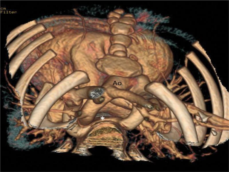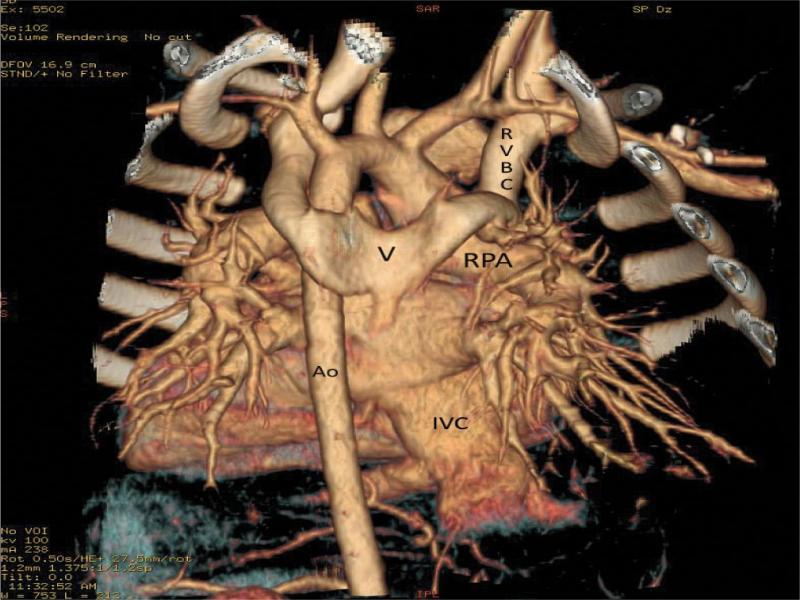 3D angiotomography reconstruction – posterior view, with removed bone elements of the posterior chest wall: vertebral column and ribs. In the foreground, a wide flattened venous vessel (V) located posteriorly from the descending aorta (Ao) is visualized. The vein is a continuation of the atypically running left brachiocephalic vein. Very clear deformation by adjacent thoracic vertebral bodies is seen; at this level, a relatively wide venous channel, probably the azygos vein, drains into the vessel from the bottom. Anomalous left innominate vein (V) joins the right brachiocephalic vein (RVBC) slightly above the junction with the right pulmonary artery (RPA). Normal drainage of pulmonary veins into the left atrium is clearly visualized. IVC – inferior vena cava