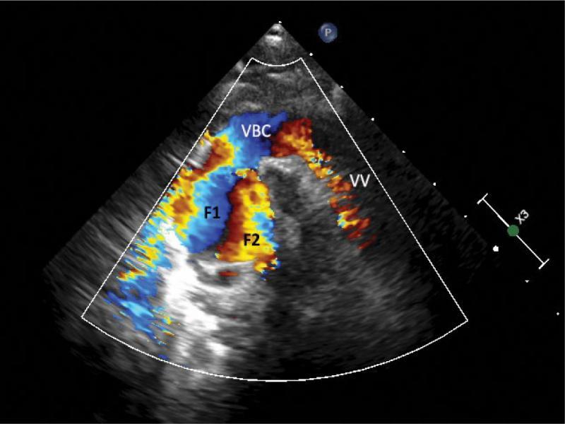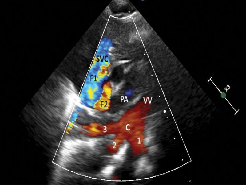 Slight anterior tilt of the probe revealed a wide, left-sided vertical vein (VV) – a connection of the pulmonary confluence and systemic veins. The SVC seems wider in this view compared to the former figure, also the upwardly directed flow appears clearer (F2)
