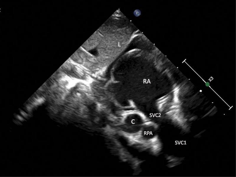 Subcostal sagittal view showing the entrance of the SVC (SVC2) to the right atrium (RA) and the interatrial septum. The diameter of the proximal part of the SVC seems normal; however, its more distal part is markedly dilated (SVC1). The valve of the foramen ovale is shifted toward the left atrium. Also visible are: transverse section of the right pulmonary artery (RPA) and the pulmonary veins’ confluence (C). The layer of the fluid in the pericardial space is suggestive of heart failure