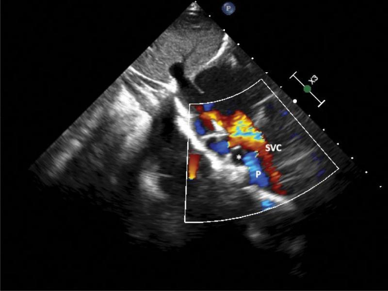 The measurement of the velocity of this flow with spectral Doppler revealed the spectrum typical for the flow in the pulmonary vein in the case of large left to right shunt (high velocity, turbulent), again – upward, directed oppositely than anticipated normal flow in the SVC