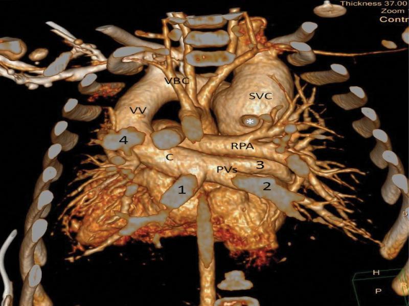 Angio-tomography 3-D reconstruction. The heart seen from the posterior perspective after removal of the vertebral column and posterior parts of the ribs. C: pulmonary vein confluence; PVs – pulmonary veins; 1 left lower, 2 – right lower, 3 – right upper. VV – vertical vein, VBC – left brachiocephalic vein, SVC – superior vena cava, * ostium of the azygos vein; RPA – right pulmonary artery. All vascular structures are clearly delineated on this picture. The only vein joining the superior caval vein has typical features of an azygos vein: runs in sagittal plane, does not receive any veins from the lungs